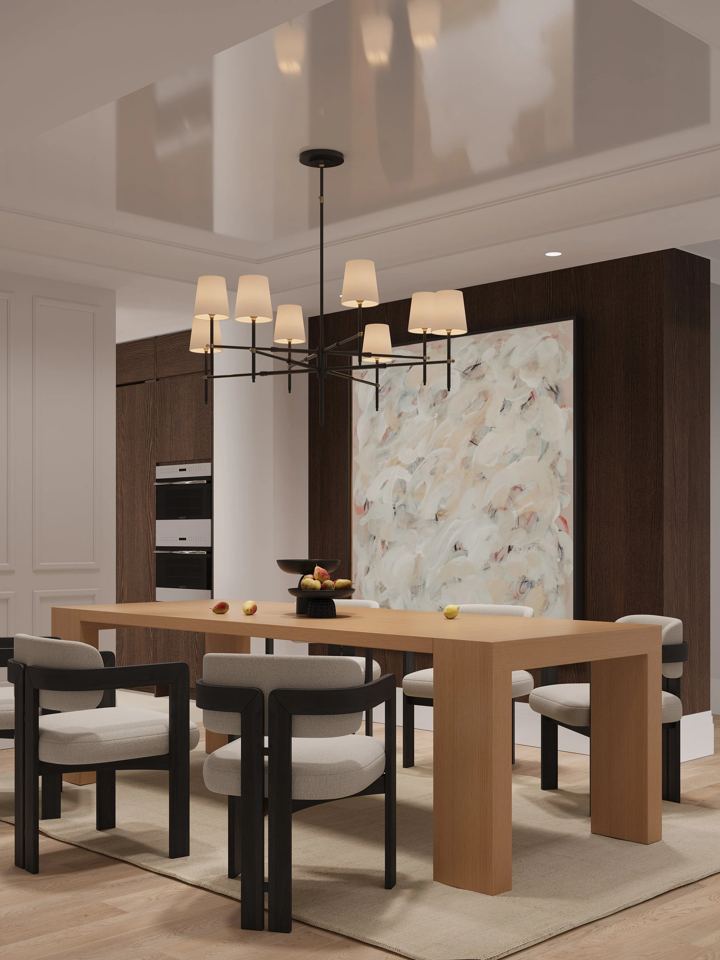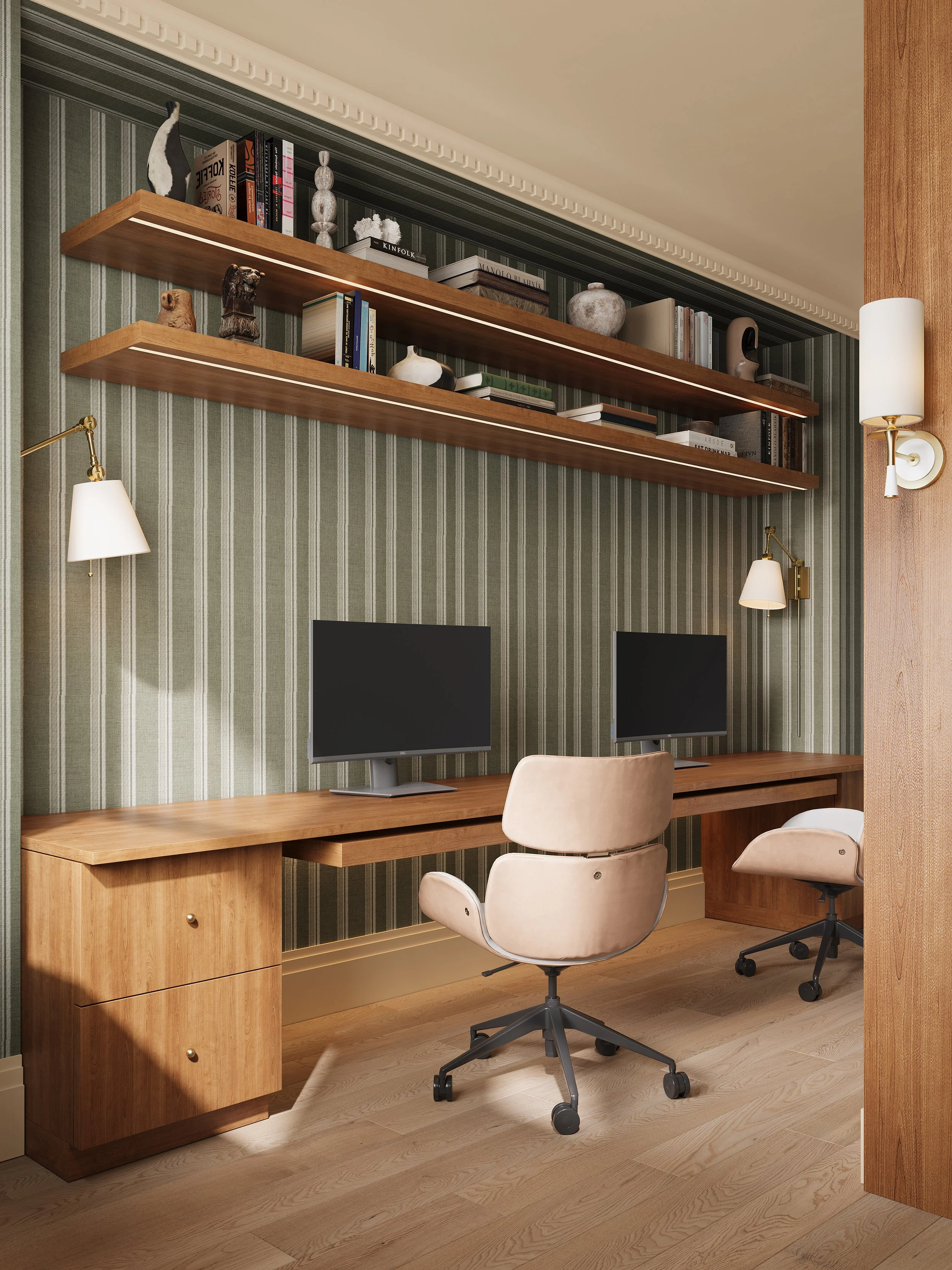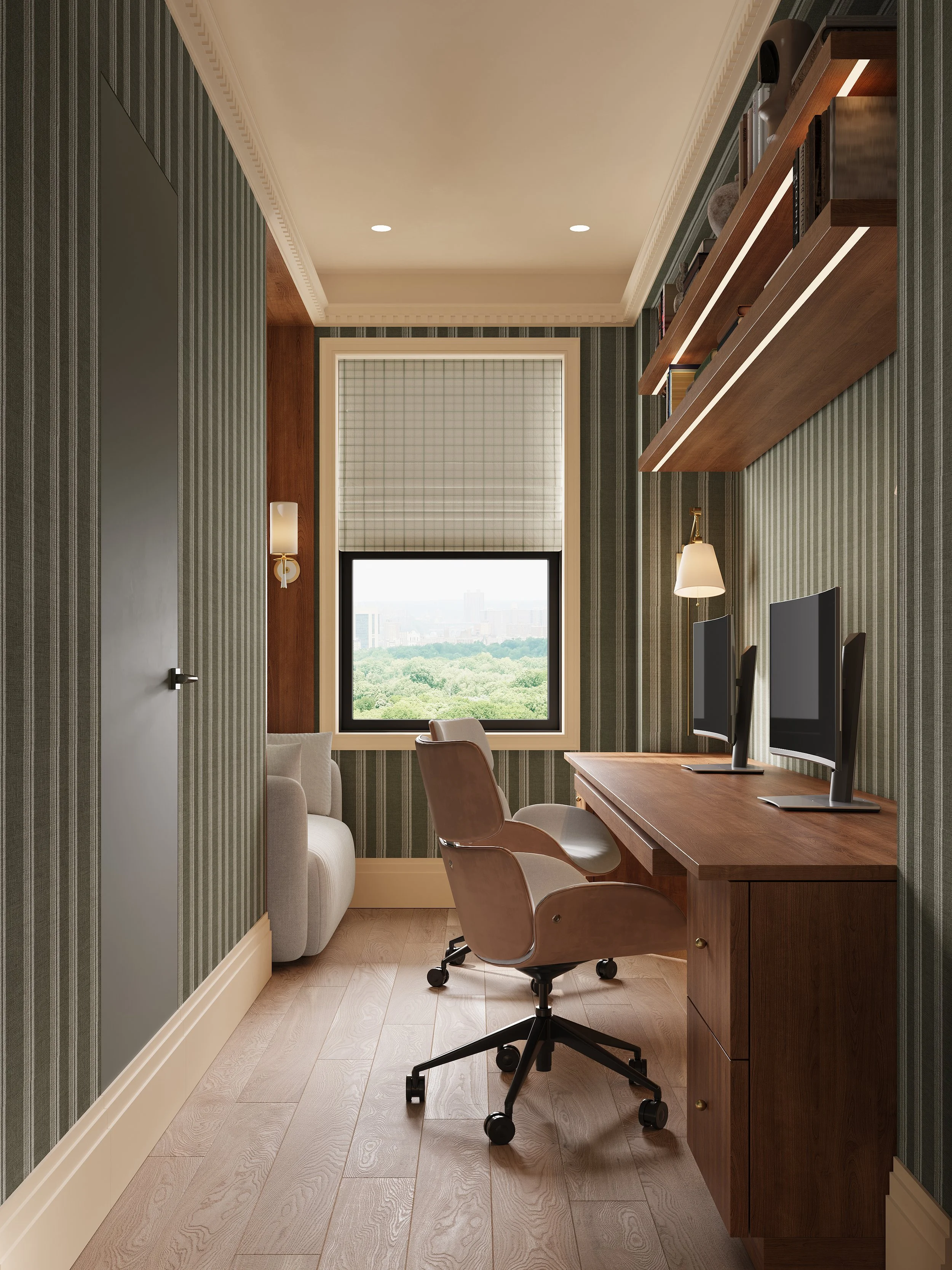 This gut renovation of a landmarked prewar condominium on the Upper West Side is designed for a family of four who love the warmth and elegance of mid-century style. The interior concept emphasizes wood paneling, clean detailing, and refined materiality, creating a home that feels both timeless and contemporary.