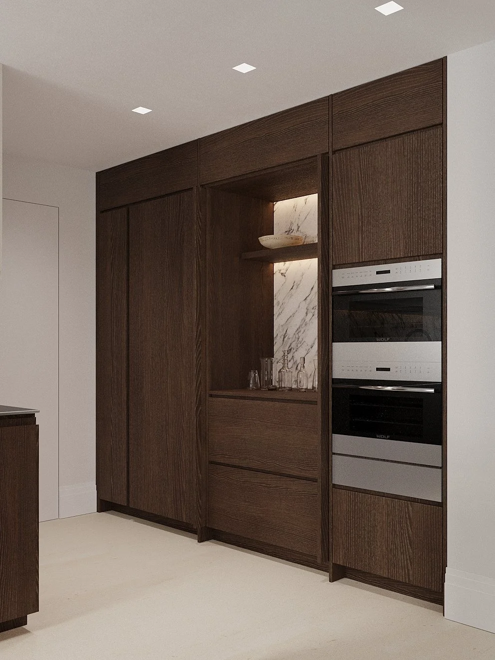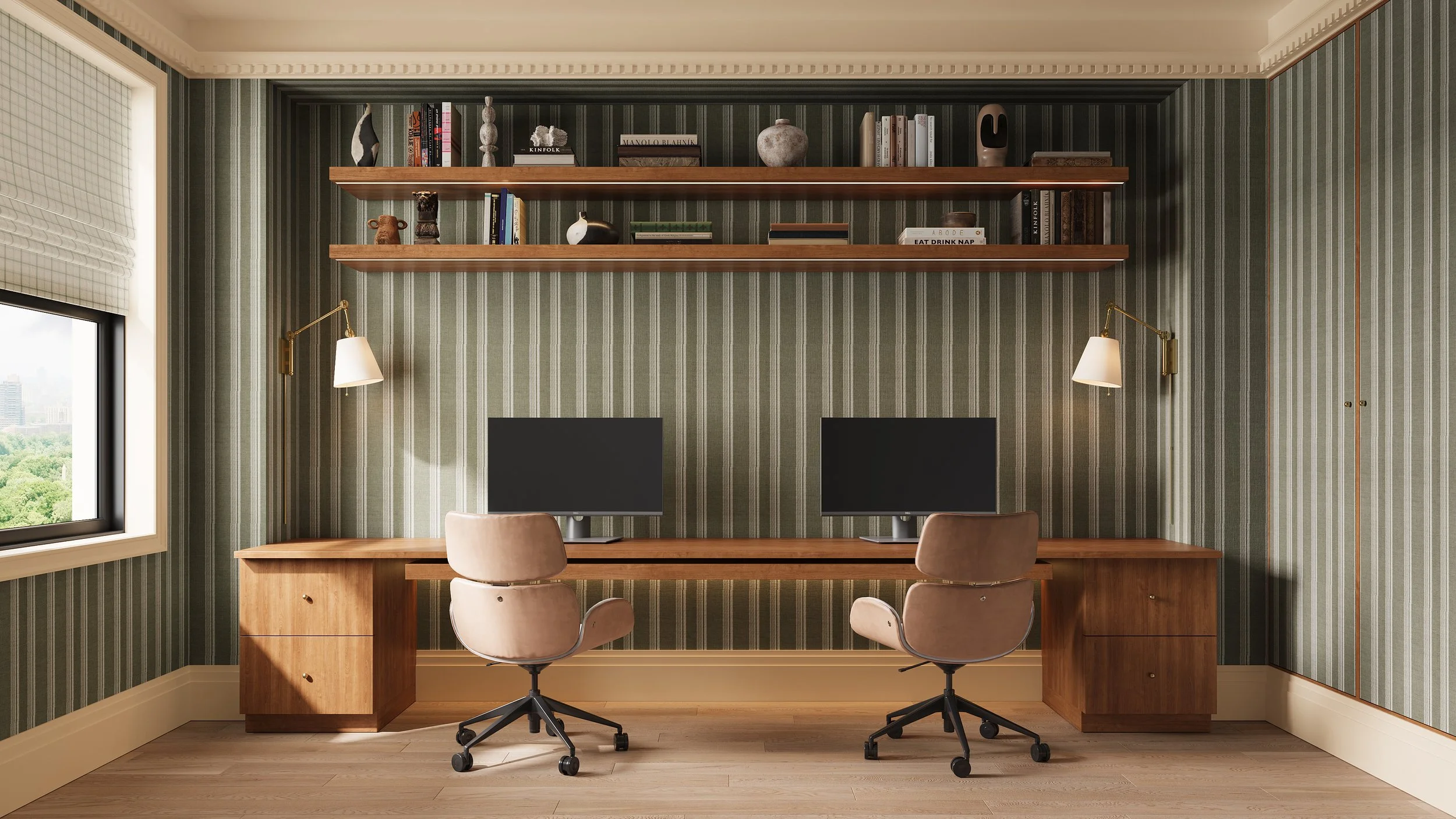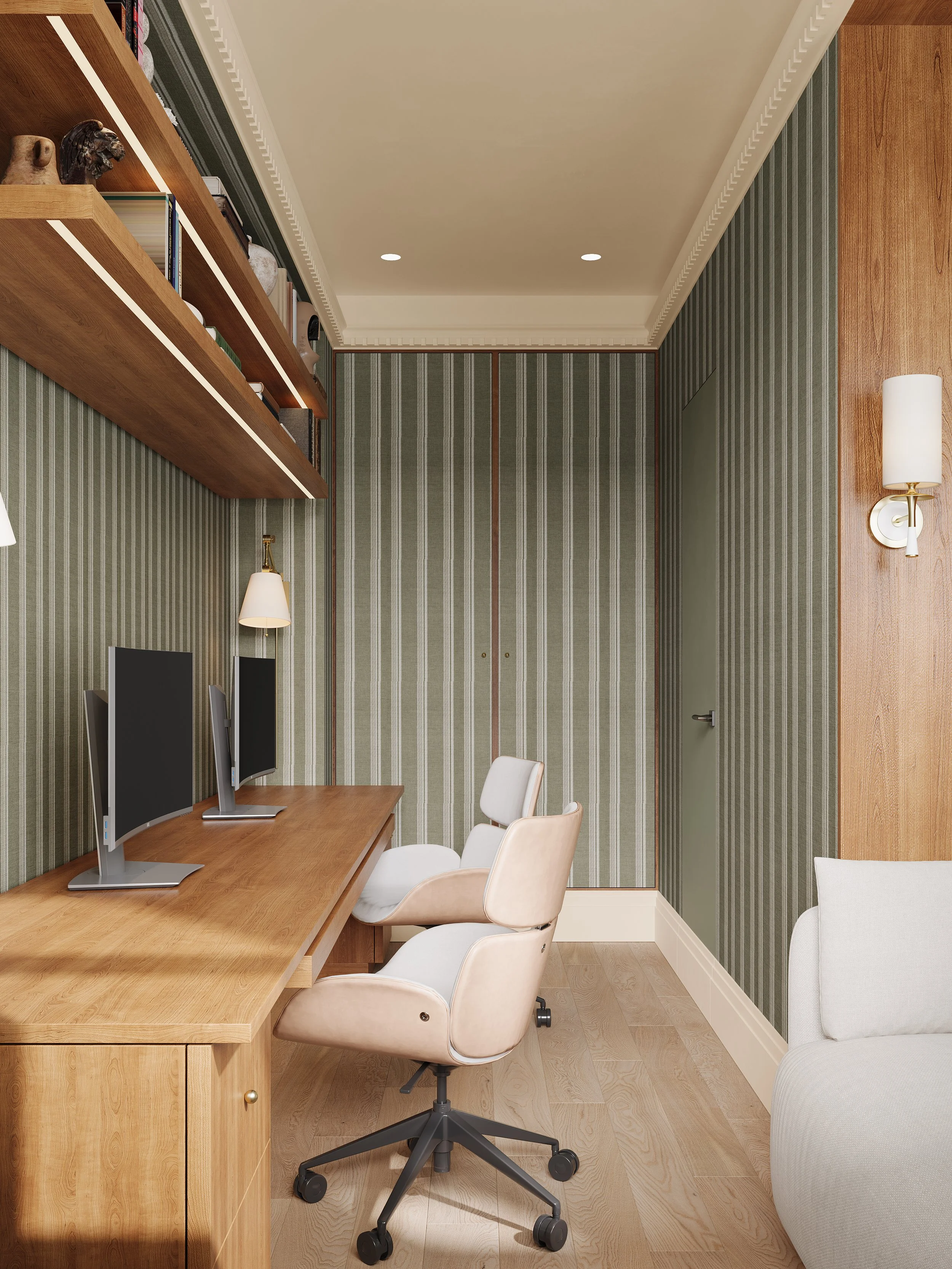 This gut renovation of a landmarked prewar condominium on the Upper West Side is designed for a family of four who love the warmth and elegance of mid-century style. The interior concept emphasizes wood paneling, clean detailing, and refined materiality, creating a home that feels both timeless and contemporary.