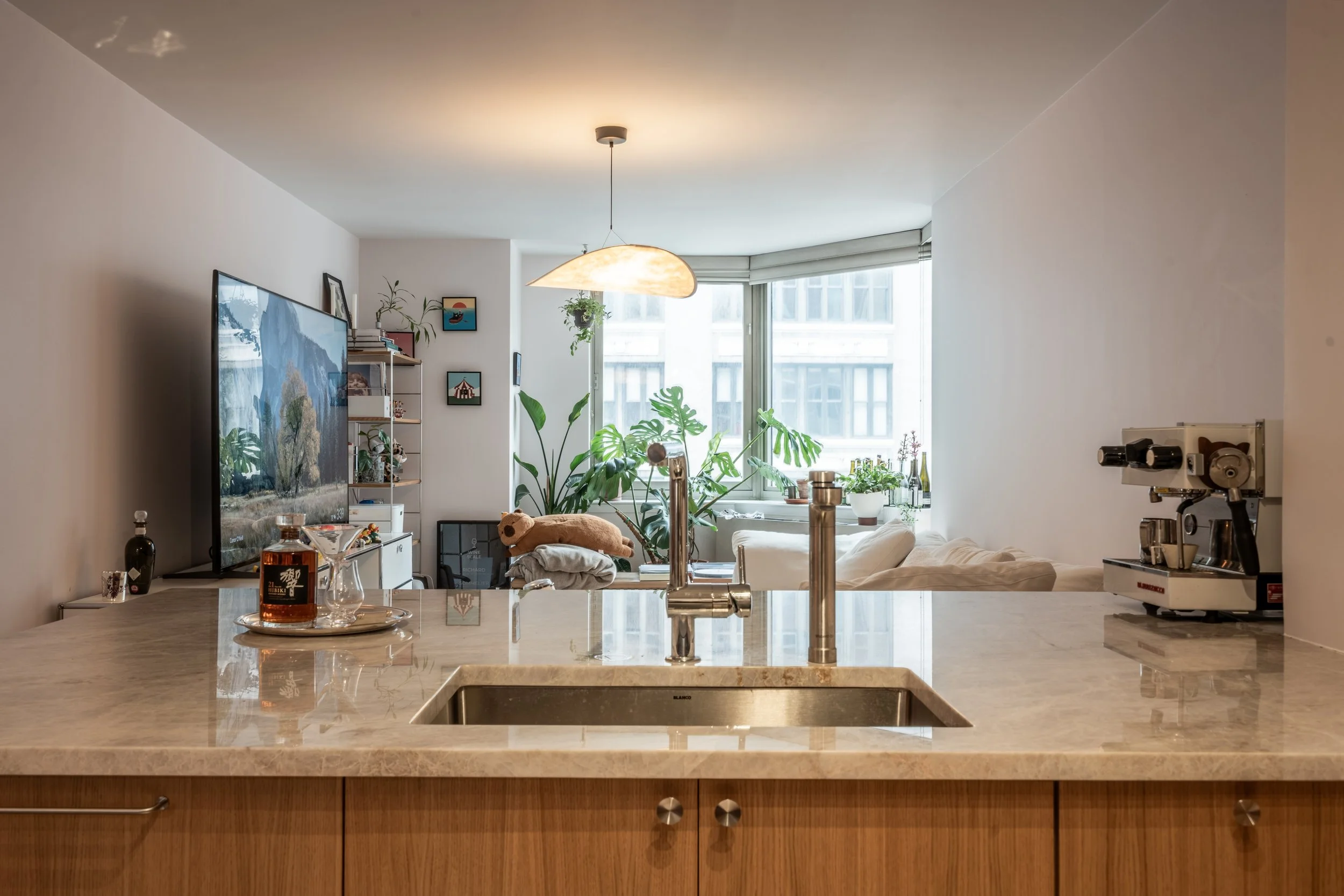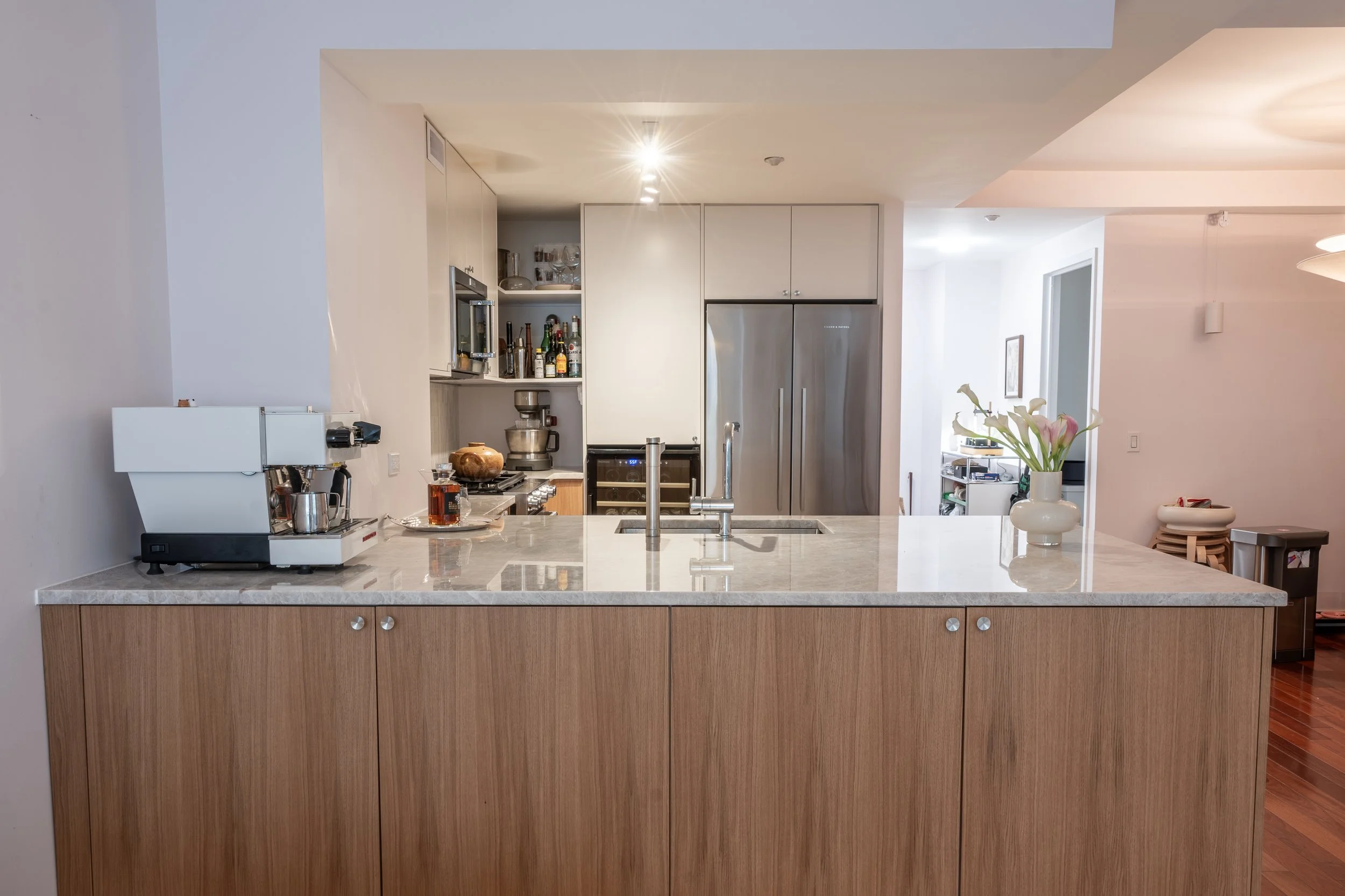 The main design goal was to transform the enclosed kitchen into an open, welcoming space that maximizes storage, countertop area, and flow. Warm white oak cabinetry balances a clean, modern aesthetic with natural texture, while the expanded countertop creates generous space for cooking, coffee, and cocktail preparation—reflecting the owner’s lifestyle and passions.