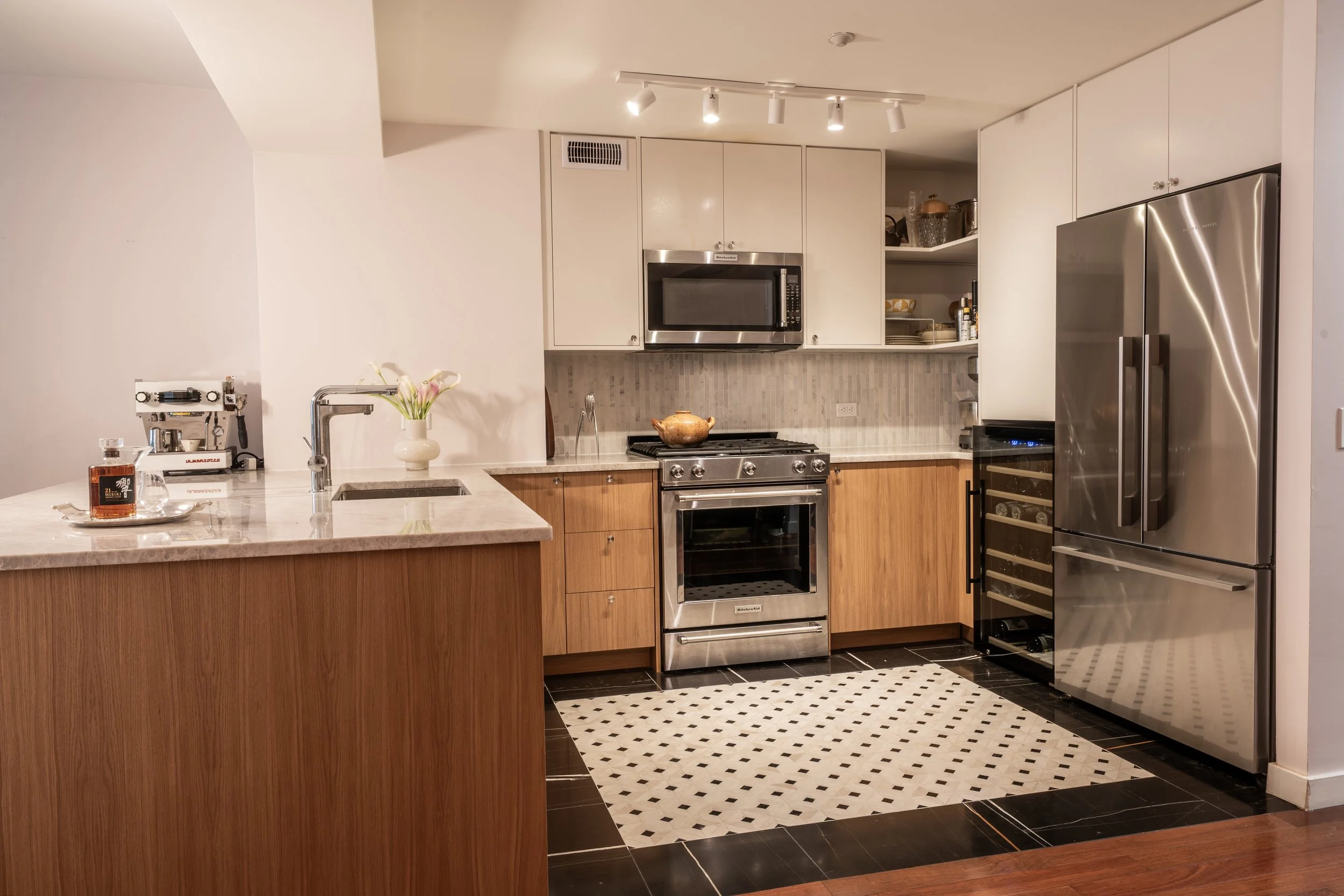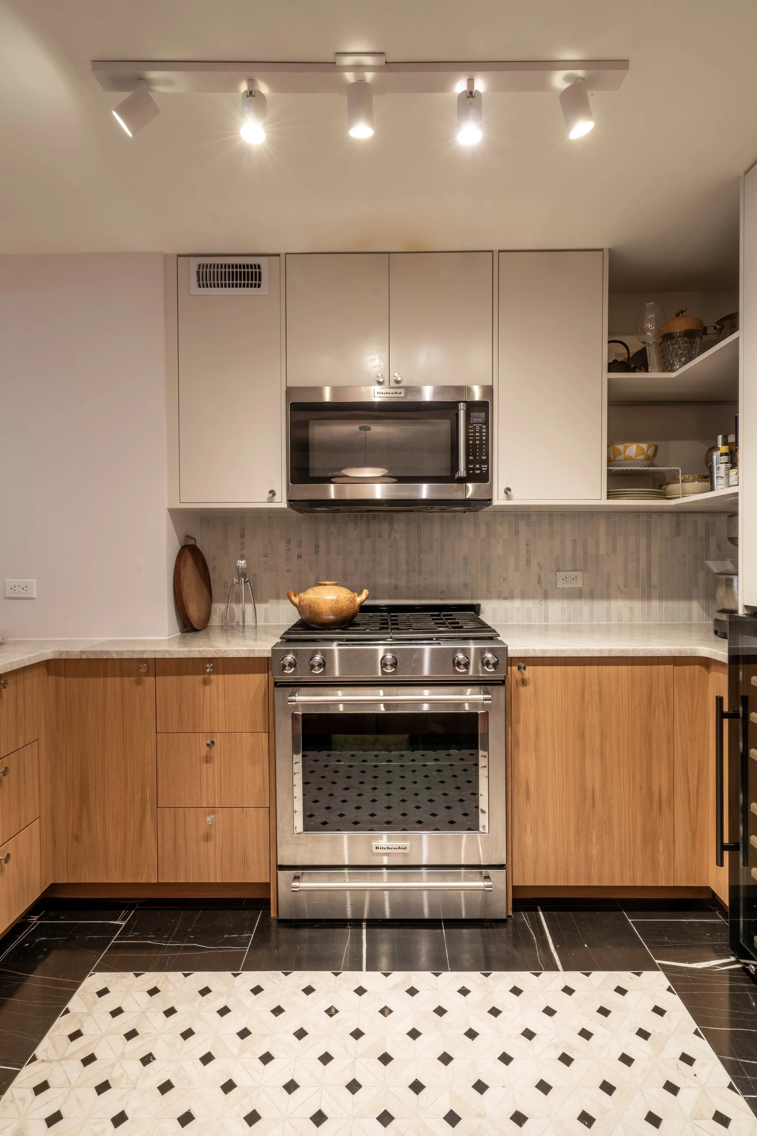This kitchen remodel reimagines the heart of a 2-bedroom, 2-bath condo in Midtown Manhattan. Our scope included securing building board approval, permit applications, full interior design of the kitchen area, coordination with cabinet brand Reform, procurement, and construction oversight.