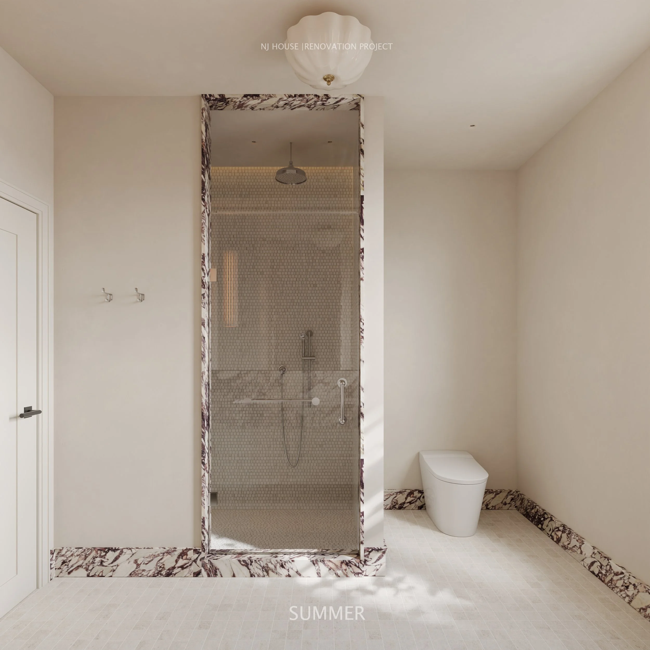Designed for a family of three, this bathroom renovation balances luxury and functionality with a refined material palette and thoughtful detailing. The centerpiece is a striking Viola marble, celebrated for its deep veining and dramatic character, bringing sculptural presence to the space.